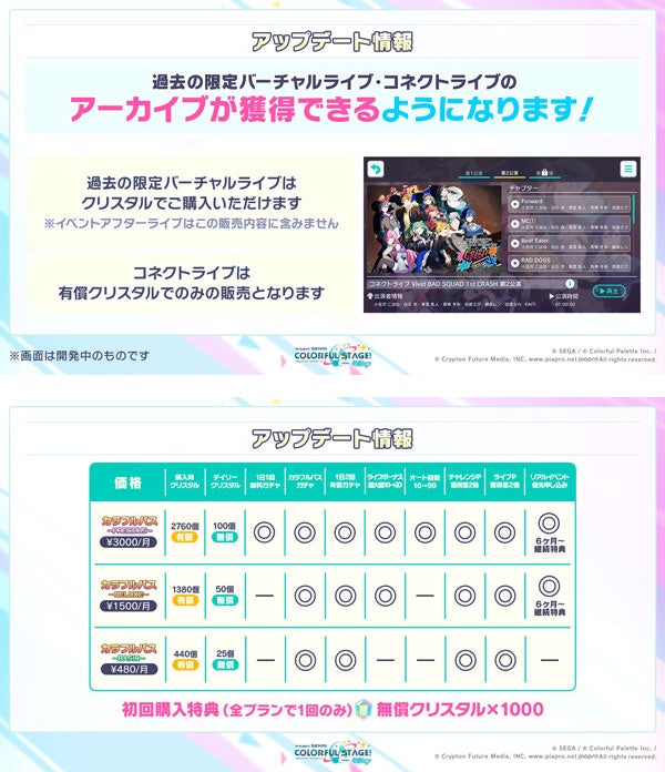 バーチャルライブやコネクトライブのアーカイブ販売や、カラフルパスのリニューアルについてなど、アップデート情報を公開いたしました。