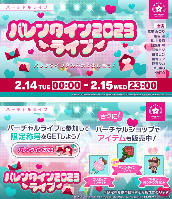 また、「バレンタイン2023 ライブ」の開催に先立ち、2月12日(日)15:00よりバーチャルショップにて、ペンライト「バレンタインブーケ」、ペンライト「ロリポップペンライト」、フルセット「バレンタインプレゼント」を販売いたします。
