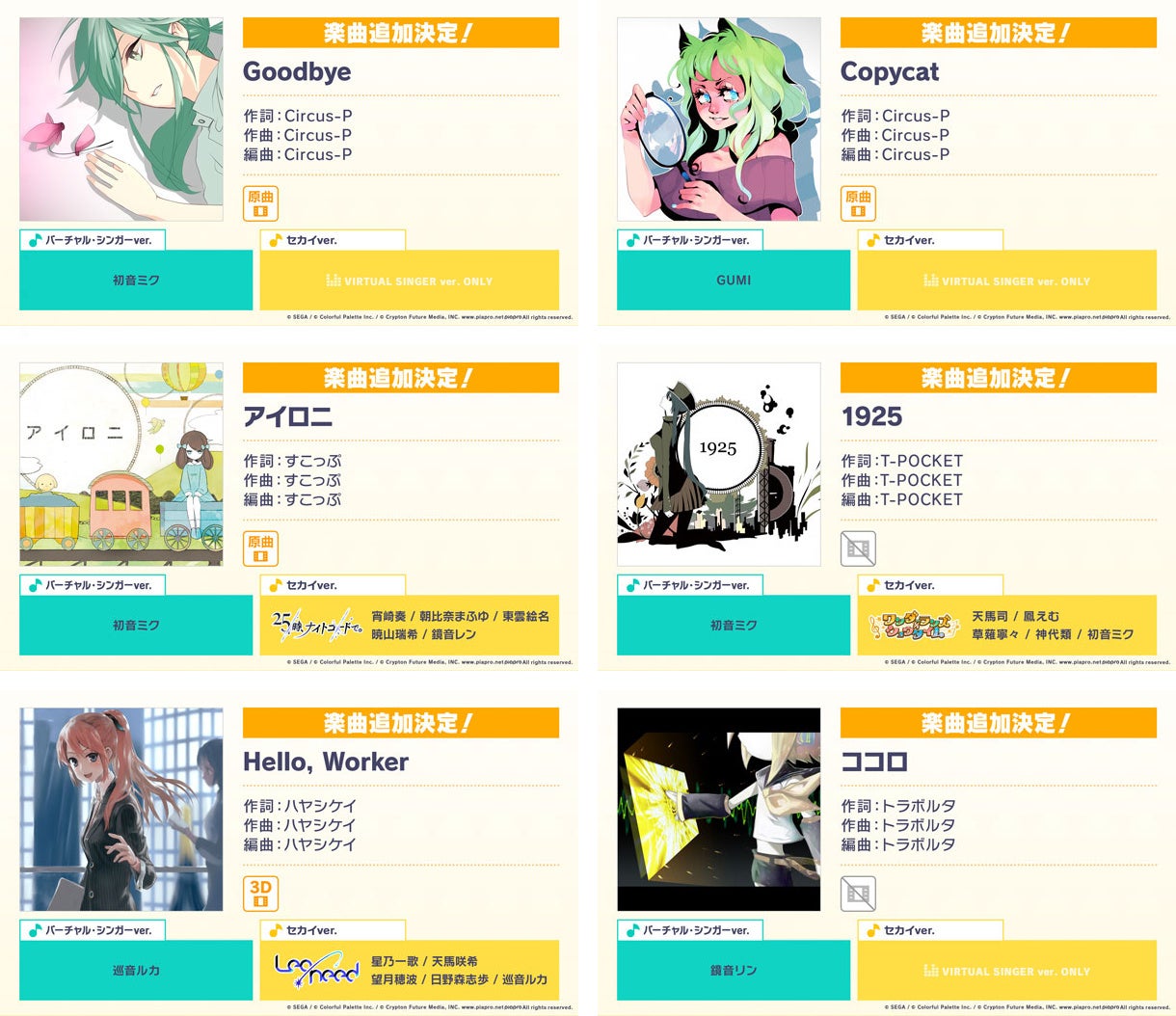 新たなリズムゲーム楽曲として、以下6曲の追加が決定いたしました。「Goodbye」と「Copycat」は『プロジェクトセカイ』グローバル版の先行リリース楽曲です。グローバル版先行リリース楽曲は、今後も順次追加予定です。