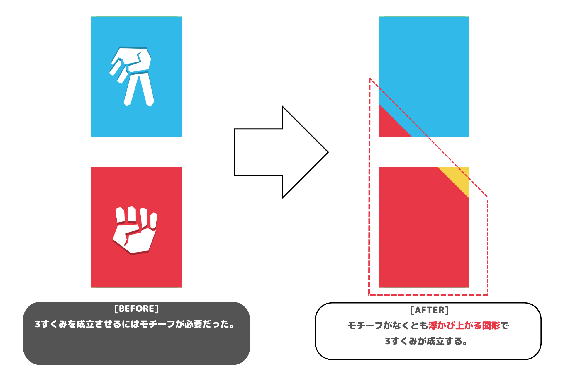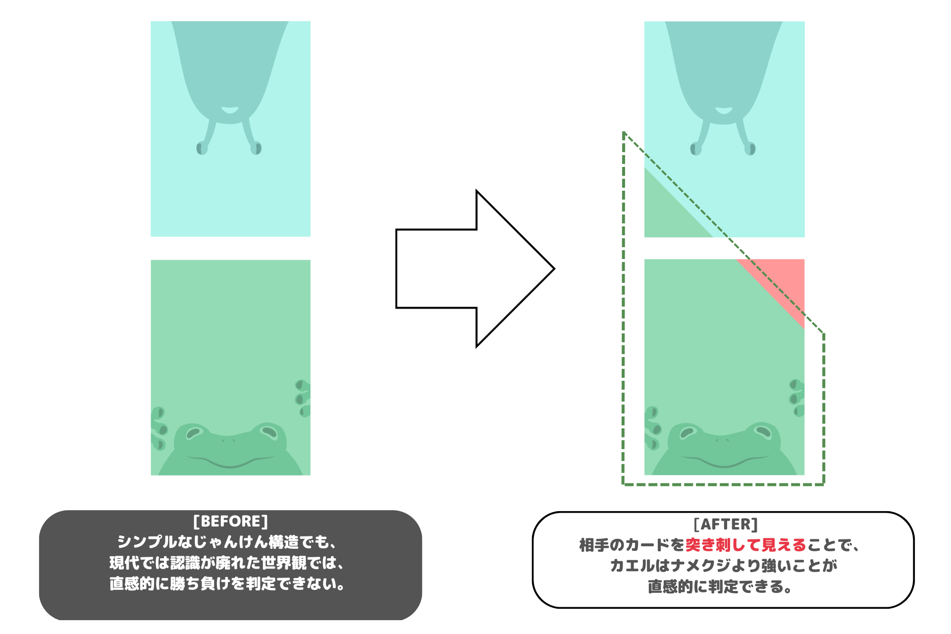 現代では馴染みのない世界観で伝わらない三すくみも、本特許のカードデザインを補助として利用することで伝わるようになる改善例を以下に示します。