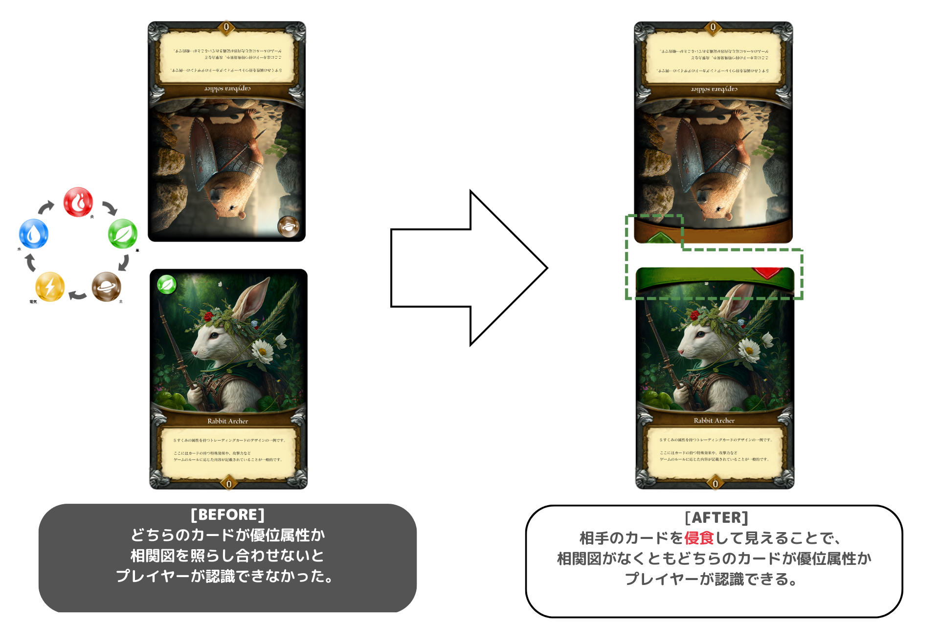 五すくみなど複雑な力関係はプレイヤーが覚えられないという問題を抱えていましたが、本特許のカードデザインを用いることで視覚的にプレイヤーに力関係を伝えることが可能になるという改善例を以下に示します。