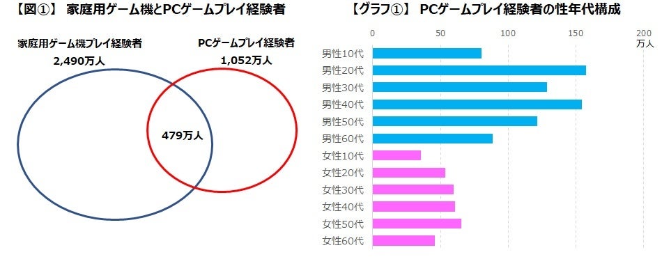 家庭用ゲーム機でゲームをプレイするゲーマーとの重なりを見ると479万人と、PCゲームプレイ経験者の45.5%は家庭用ゲーム機でもゲームプレイ経験があるものの、5割以上がPCゲームのみのプレイ経験者となっています。【図①】
