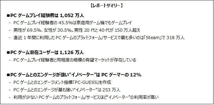 ニーズを知るためにはリサーチを行うことが必要となる場合が多いのですが、未知のユーザー層の情報を得るにはユーザーサンプリングや企画設計が非常に大切であると言えます。ぜひ、「PCゲーム調査専用パネル」また、「PC-GUESS」指標を有効にご活用ください。
