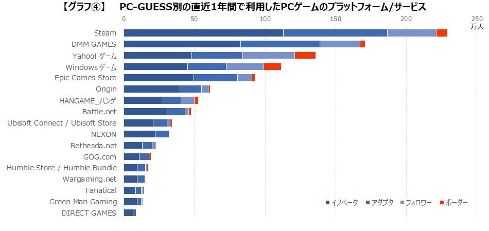 また、利用がまだ少ないプラットフォーム/サービスではイノベーターのシェアが目立ちます。「GOG.com」「Humble Store」「Green Man Gaming」「DIRECT GAMES」といったDRMフリーゲームの販売やKEYセールの利用者は少なく、このサービスのベネフィットを日本のユーザーが受け入れられるかどうかは今後注視していきたいと思います。