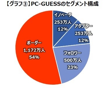 最もPCゲーム市場にコミットメントしている「イノベーター」は253万人(12%)であり、マーケットを牽引する存在となっています。それに次ぐ「アダプター」も253万人であり、500万人で構成される「フォロワー」へつなぐ役割を担います。この3セグメントで1,000万人規模の市場となっており、今後のマーケット拡大のキーになる1,172万人という最大セグメントである「ボーダー」が控えています。【グラフ③】