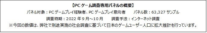 弊社はネットリサーチに対応した調査用データベースを構築しており、今回新たに7万人を超える規模の「PCゲーム調査専用パネル」を構築しました。
