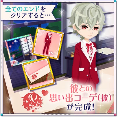 龍馬・本編彼目線ストーリーの「愛エンド」をクリアすると、“真紅の愛されタキシード”をプレゼント!さらに「愛エンド」「絆エンド」の両エンドをクリアすると“彼との思い出コーデ”が完成!