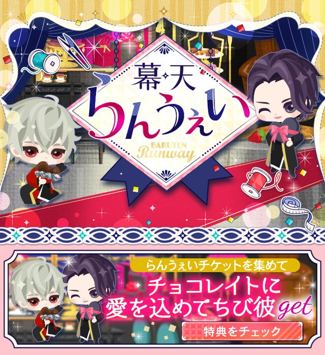 さらに、2月1日(水)よりアプリ内イベント「幕天らんうぇい」を開催いたします。“チョコレイトに愛を込めてちび彼”や“ゴシックエレガントな花柄着物”などこの時期ならではのアバターをご用意しておりますので、坂本龍馬の本編彼目線と合わせて、イベントもお楽しみください。