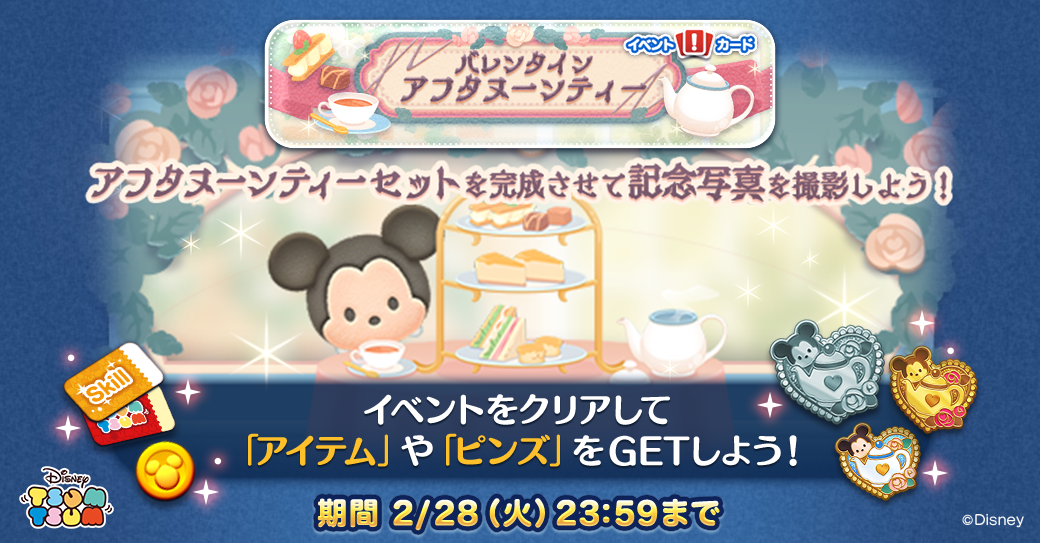 2月1日(水)より、バレンタインイベントに合わせて、ハートモチーフの可愛らしい新ツム「ラブリースティッチ&エンジェル」「ラブリークラリス」「ラブリーティンク」の3種類がゲーム内に登場いたします。今回登場する「ラブリースティッチ&エンジェル」は、初回確率アップ期間中の初獲得時にスキルレベル3の状態で獲得できます。また、2月3日(金)からは、ミッションをクリアして、アフタヌーンティーセットを完成させる新イベント「バレンタイン アフタヌーンティー」を開催いたします。「トッピングミッション」や「リーフミッション」など、2種類の特殊ミッションに挑戦してティーセットを完成させましょう。