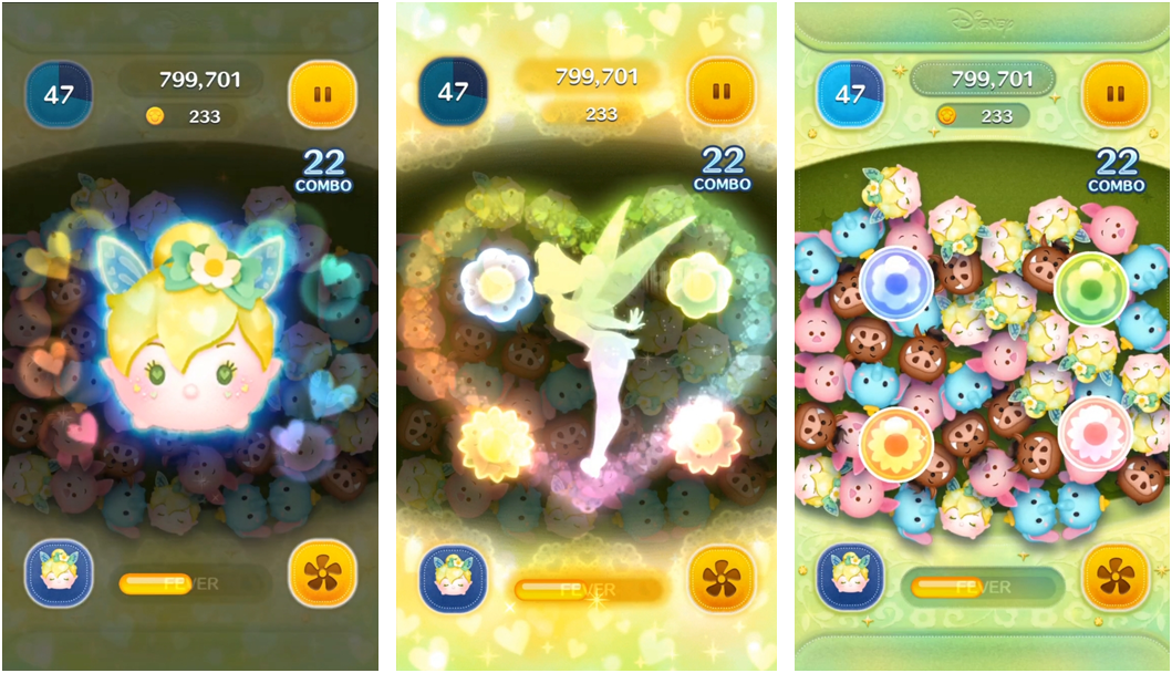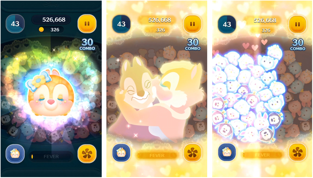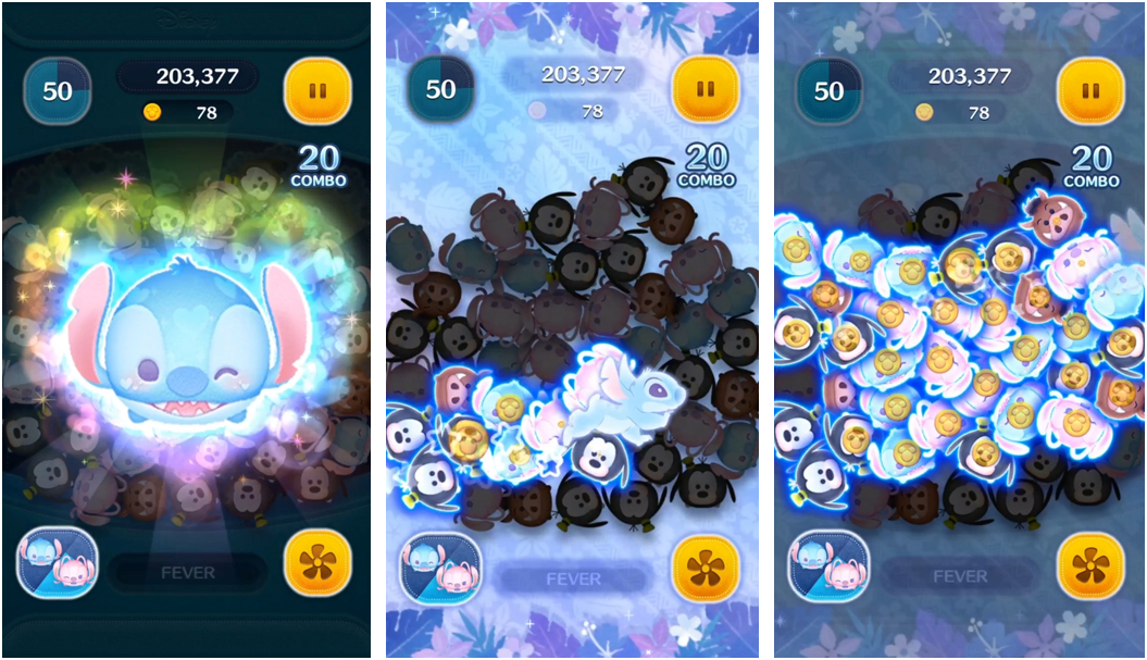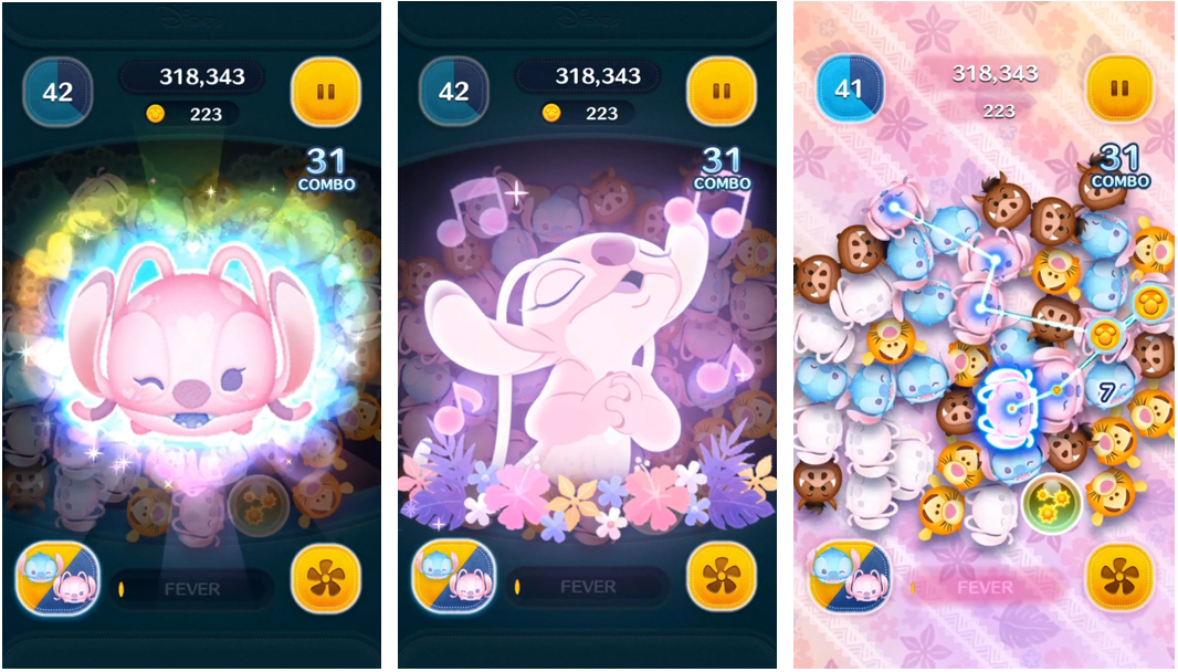 ラブリースティッチ+ラブリーエンジェルのスキル:エンジェルのスキル中にスティッチのスキルを使うと横ライン状にツムを消したあとさらに画面中央のツムを消すよ!