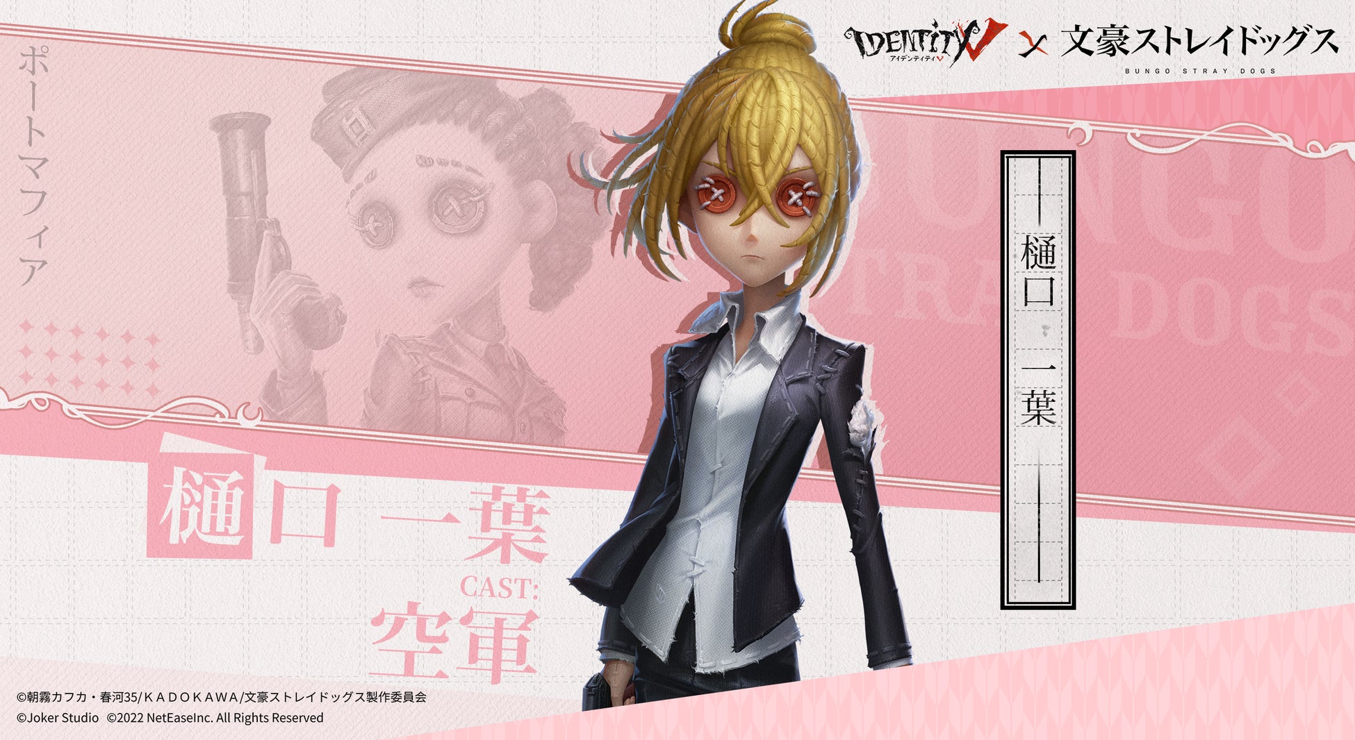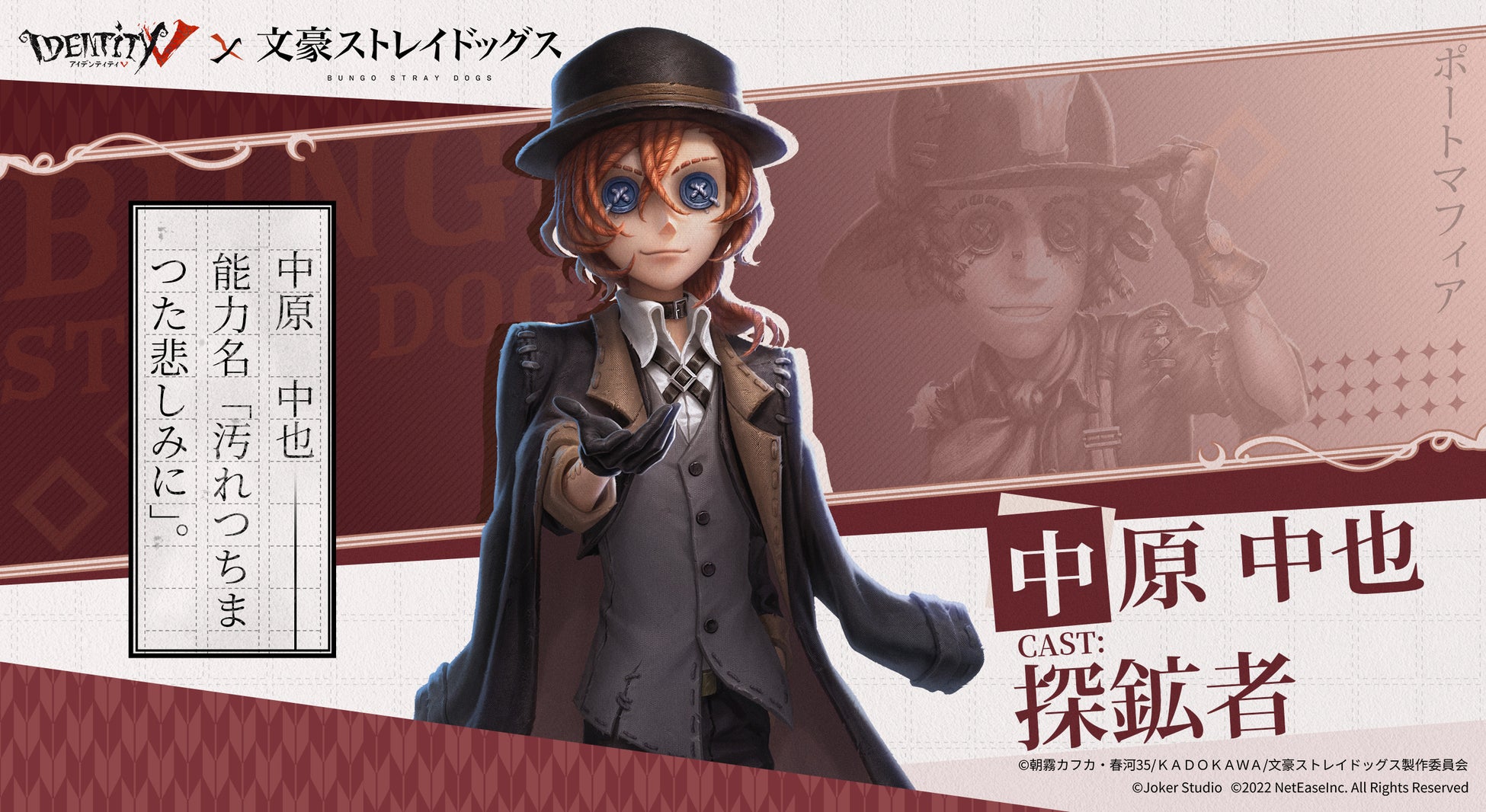 2023年2月2日~3月1日、『Identity V第五人格』×『文豪ストレイドッグス』が第二弾コラボを敢行!コラボ真髄には、占い師UR衣装-芥川龍之介、曲芸師SSR衣装-梶井基次郎、マジシャンSSR衣装-広津柳浪、空軍SSR衣装-樋口一葉の他、コラボ限定の携帯品、アイコン、落書きもラインナップ。また、コラボパックとして、探鉱者UR衣装-中原中也、探鉱者UR携帯品-葡萄酒もショップに登場する。