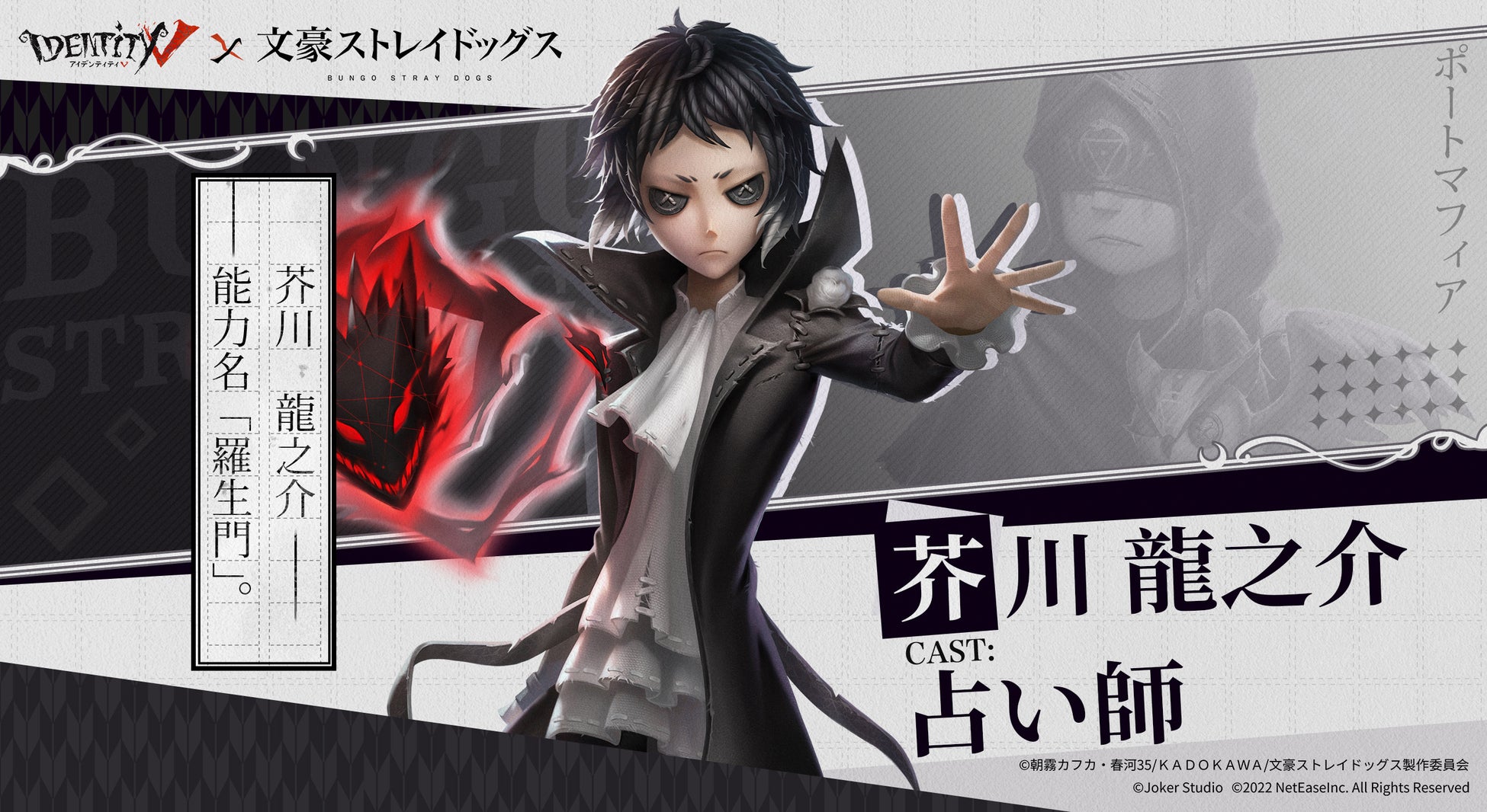 芥川龍之介は病弱な体で、黒外套から全てを切り裂く黒獣(こくじゅう)を生む異能「羅生門」を駆使する。一方、占い師は幻影による対話と使い鳥によって特殊能力を獲得した。占い師がUR衣装-芥川龍之介を身につけたら、どんなチェイスが繰り広げられるだろうか?