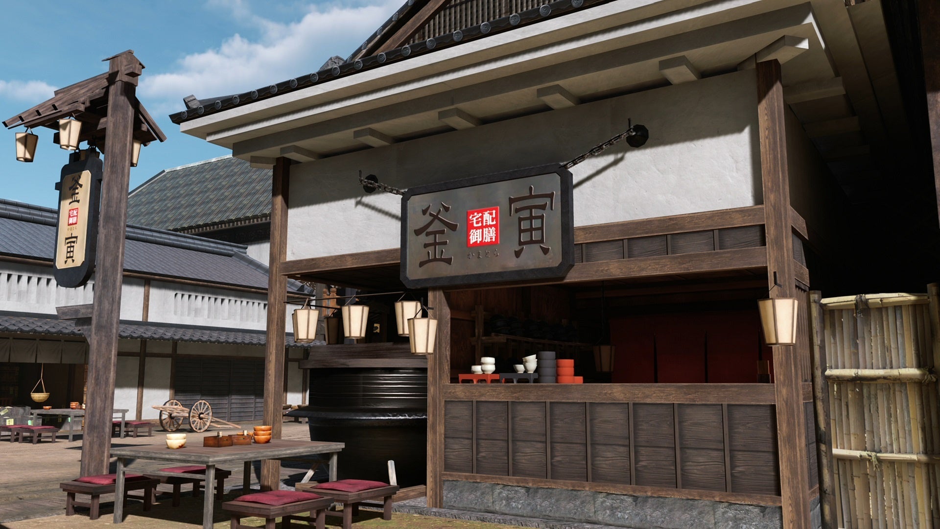 『龍が如く 維新! 極』ではゲーム内に実在する様々な店舗が立ち並びます。「宅配御膳 釜寅」をイメージした店舗では、釜飯を食べることで龍馬の体力を回復することができます。