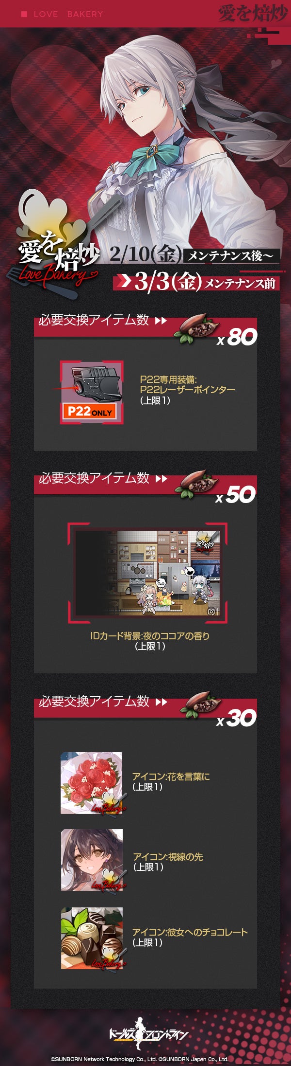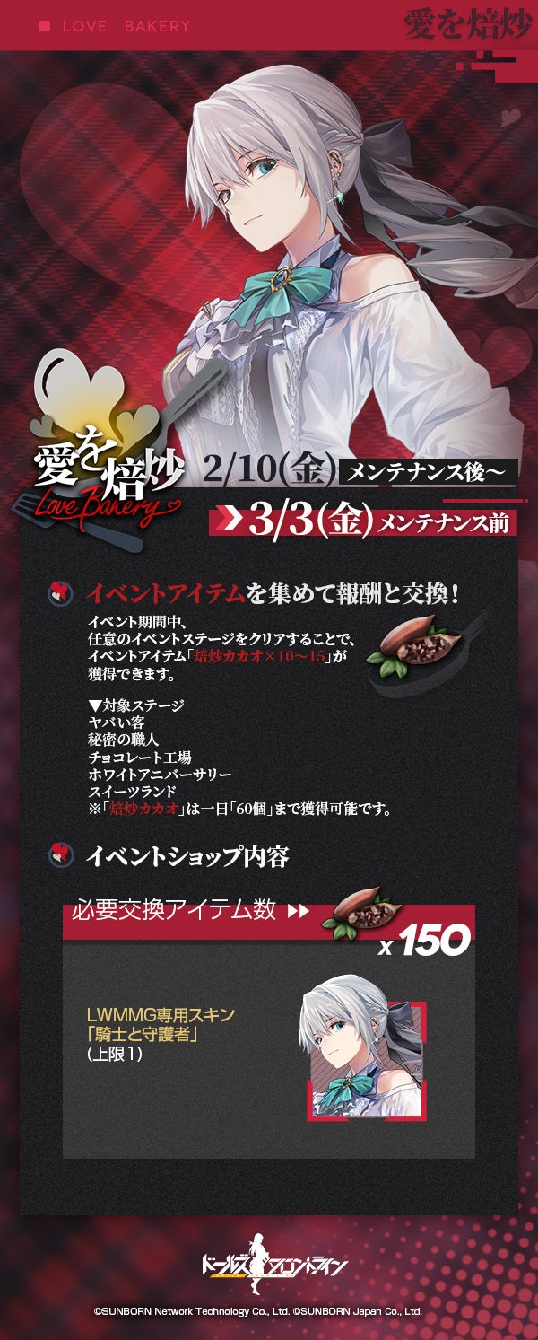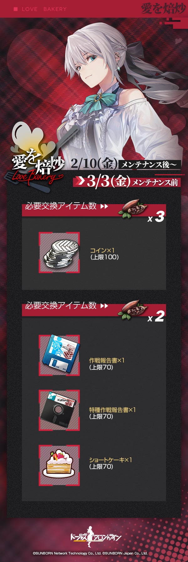 株式会社サンボーンジャパンは、スマホ向け戦略型シミュレーションゲーム『ドールズフロントライン(以下、「ドルフロ」)』において、チョコをめぐる新イベント『愛を焙炒』が2月10日(金)に開催されることをお知らせいたします。