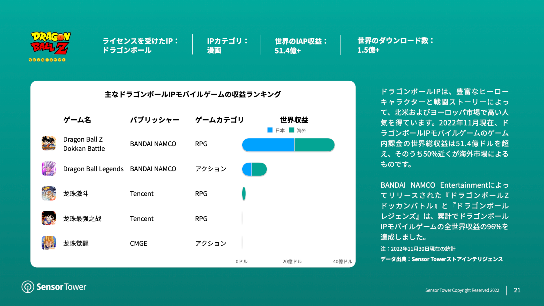 その他にも、ドラゴンボールIPモバイルゲームの海外収益がポケモンIPモバイルゲームに次いで高く、このゲームを代表する『ドラゴンボールZ ドッカンバトル』と『ドラゴンボール レジェンズ』は数年連続で海外における日本のモバイルIPゲーム収益ランキングで上位となっています。
