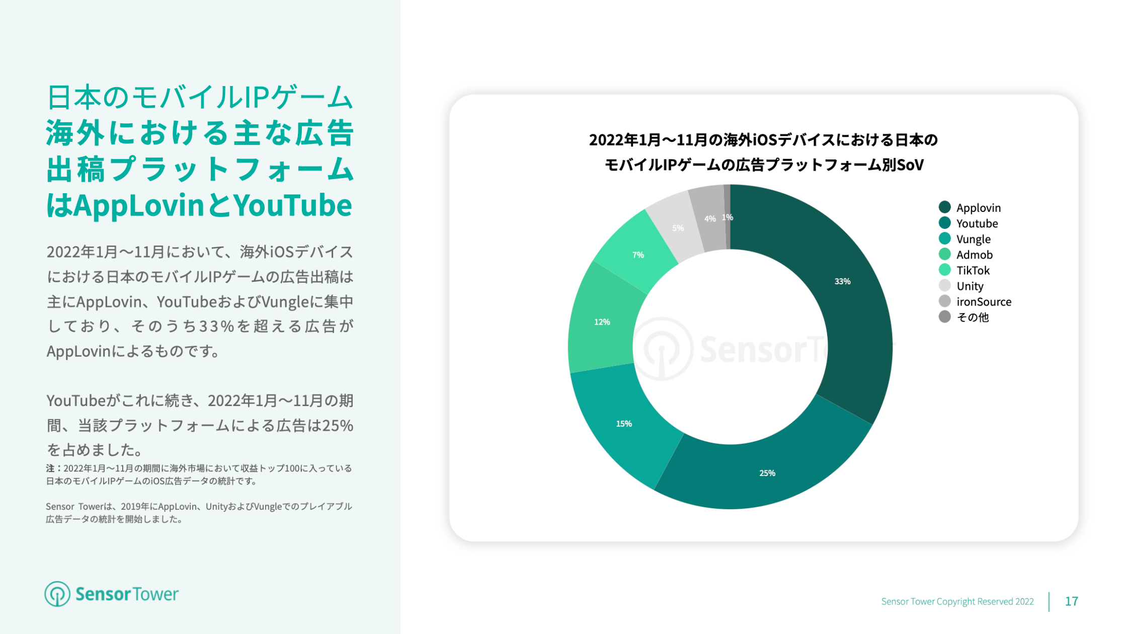海外における日本のモバイルIPゲームの広告出稿は主にAppLovin、YouTubeおよびVungleに集中しています。2022年1月~11月において、海外iOSデバイスにおける広告の33%以上がAppLovinによるもので、25%のYouTubeがそれに続きます。