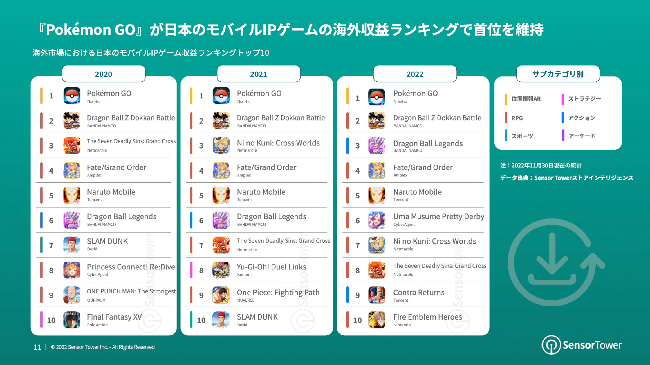 Nianticによるモバイルゲーム『Pokémon GO』は日本のモバイルIPゲーム海外収益ランキングのトップを維持し、ポケモンを海外で最も収益力のある日本のIPに成長させました。2022年1月~11月の期間、海外における日本のモバイルIPゲーム収益ランキングのトップ100では、ポケモンIPモバイルゲームの収益は5.7億ドルを突破し、日本のモバイルIPゲームの海外総収益の23%を超えるシェアを誇っています。