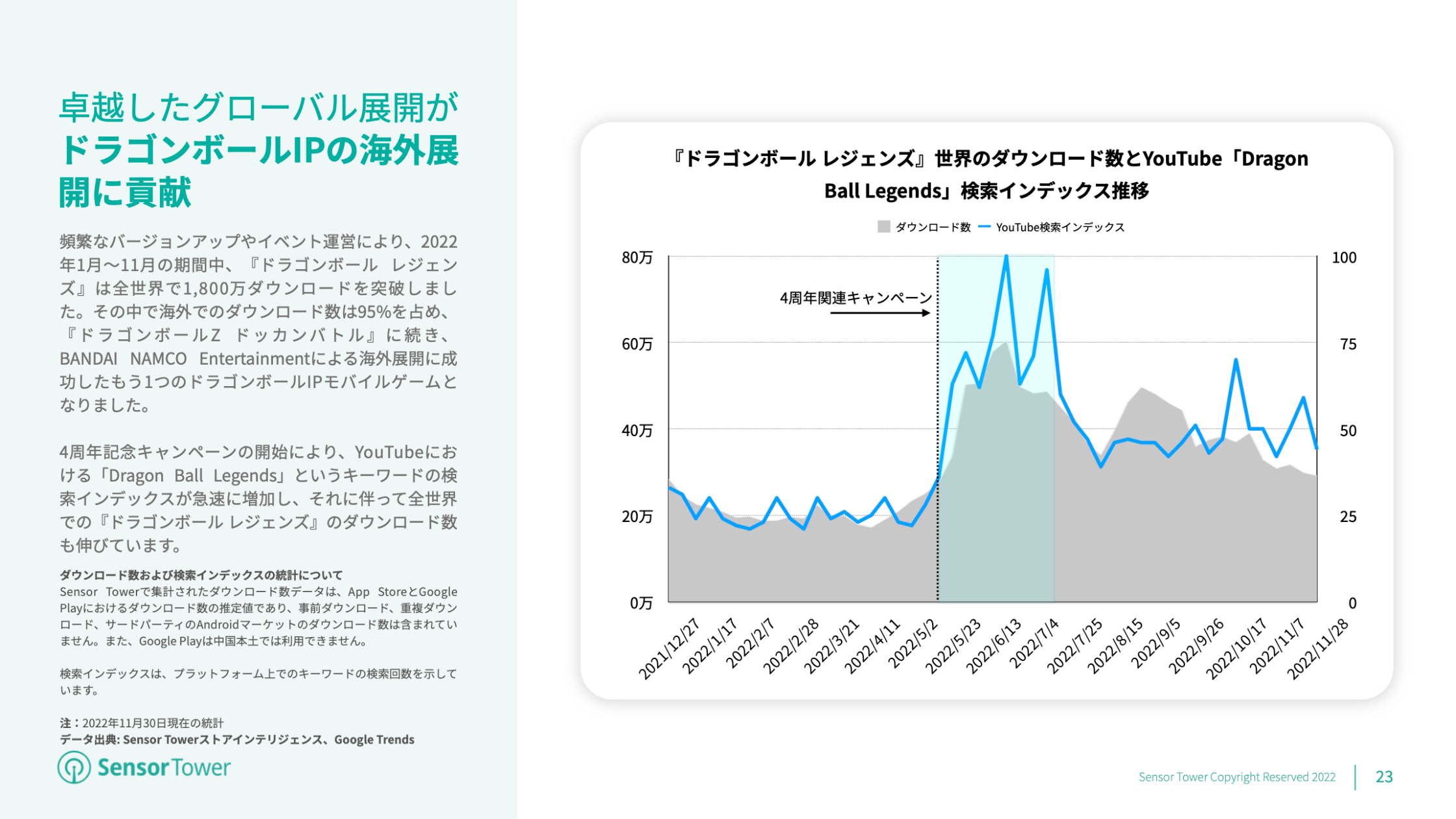 4周年記念キャンペーンの開始により、YouTubeにおける「Dragon Ball Legends」というキーワードの検索インデックスが急速に増加し、それに伴って全世界でドラゴンボールIPモバイルゲームの代表作『ドラゴンボール レジェンズ』のダウンロード数も増加しました。卓越したグローバル展開を継続した結果、『ドラゴンボール レジェンズ』は2022年1月~11月の全世界ダウンロード数が1,800万回を超え、その95%が海外市場からのダウンロードとなっています。