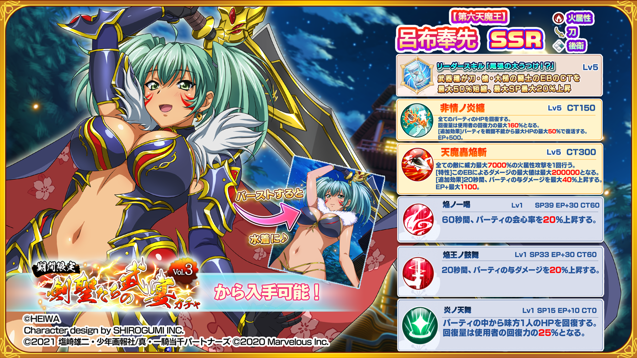 本日開始の「剣聖たちの武宴ガチャVol3」では、新たに「【第六天魔王】呂布奉先」(CV: 渡辺 明乃)」が登場。