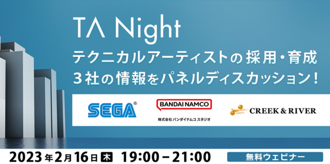 - TA Night テクニカルアーティストの採用・育成 3社の情報をパネルディスカッション!~セガ×バンダイナムコスタジオ×クリーク・アンド・リバー社~