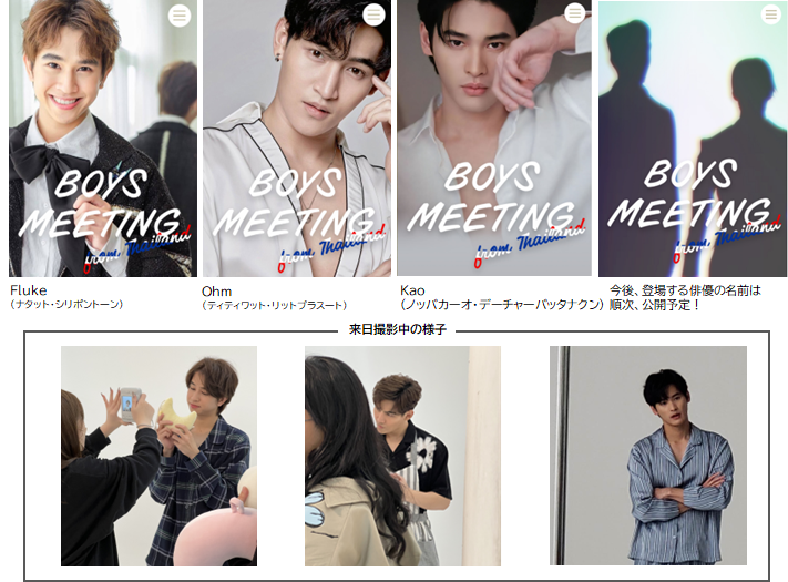 2月までに5名のうち3名、テレビドラマ「Until We Meet Again~運命の赤い糸~(2019)」でW主演を務めた、Ohm(ティティワット・リットプラスート)&Fluke(ナタット・シリポントーン)、そして「Lovely Writer The Series」主演俳優のKao(ノッパカーオ・デーチャーパッタナクン)が来日。都内スタジオで撮影が行われました。