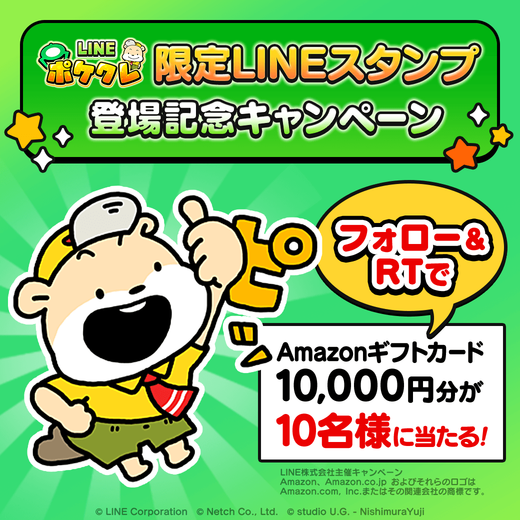 「トッチャル」限定LINEスタンプの登場を記念して、「LINE ポケクレ」の公式Twitterアカウント(@line_pokekure)をフォローし対象ツイートをリツイートすると、抽選で10名様にAmazonギフトカード番号10,000円分が当たるTwitterキャンペーンを開催いたします。