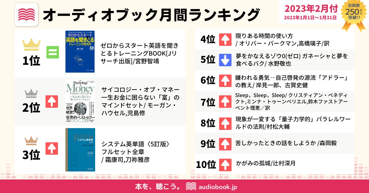 日本一のオーディオブック書籍ラインナップ数(※)を配信する「audiobook.jp」を運営する株式会社オトバンク( 本社:東京都文京区、代表取締役社長:久保田裕也、以下「オトバンク」)は、当社が運営する会員数が250万人を突破した日本最大級のオーディオブック配信サービス「audiobook.jp」におけるオーディオブック月間ランキング2月付(2023/1/1~1/31)を発表します。
