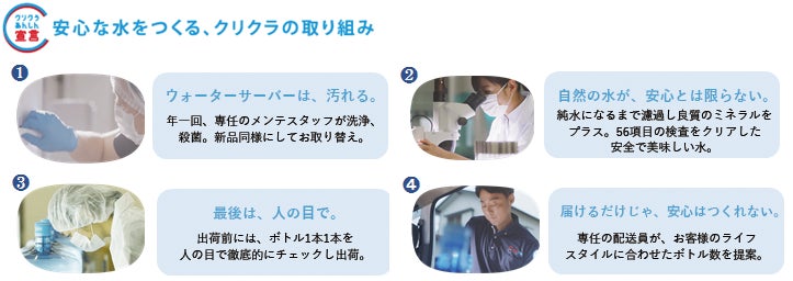 12年連続お客様満足度No.1※ の「クリクラ」は、2002年の事業開始以来、「安心・安全」を理念に、現在約500拠点の配送ネットワークでご家庭やオフィスに直接製品を配送しています。環境に配慮したサステナブルなボトルの採用や輸送によるCO2削減、サーバーの100%リサイクルなどの循環型社会を目指した取り組みを行うとともに、今後もクリクラに携わる研究員、メンテスタッフ、配送員などすべてのプロフェッショナルが協力のもと、お客様へ安心・安全なお水をお届けしてまいります。