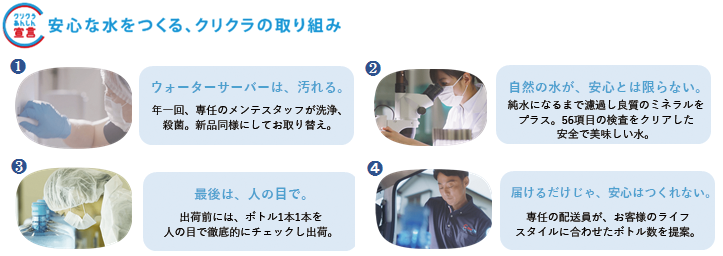 12年連続お客様満足度No.1※ の「クリクラ」は、2002年の事業開始以来、「安心・安全」を理念に、現在約500拠点の配送ネットワークでご家庭やオフィスに直接製品を配送しています。環境に配慮したサステナブルなボトルの採用や輸送によるCO2削減、サーバーの100%リサイクルなどの循環型社会を目指した取り組みを行うとともに、今後もクリクラに携わる研究員、メンテスタッフ、配送員などすべてのプロフェッショナルが協力のもと、お客様へ安心・安全なお水をお届けしてまいります。