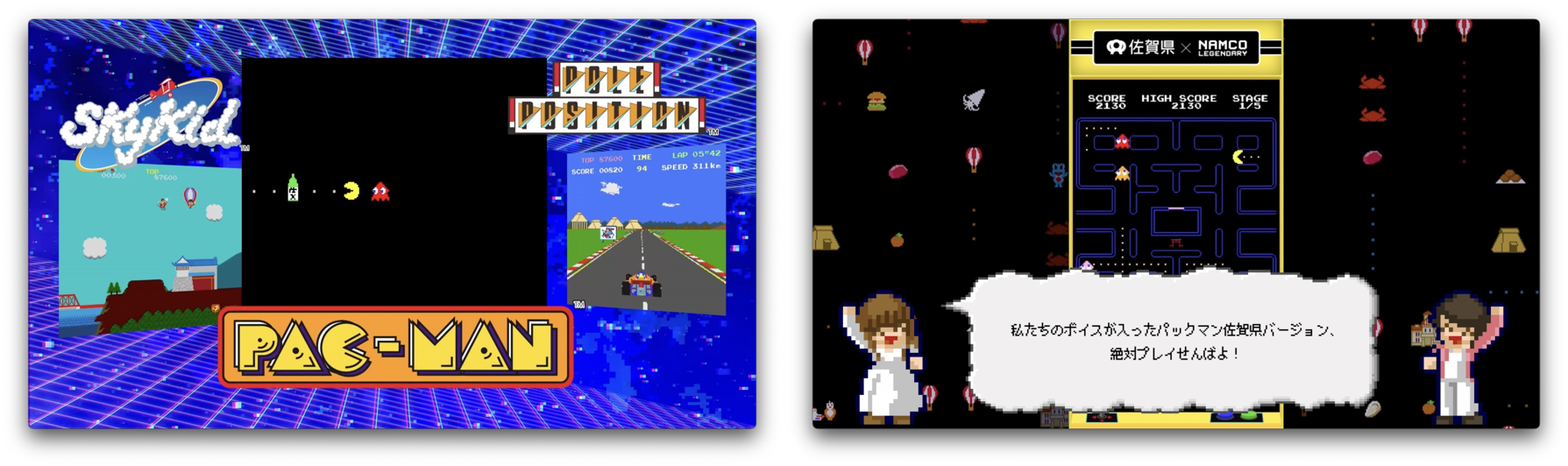 本プロジェクトでコラボレーションするゲームは、「パックマン」、「ポールポジション」、「ゼビウス」、「スカイキッド」、「ワルキューレの伝説」の全5タイトル。各タイトルと佐賀県とのコラボGIFアニメをご用意いたしました。例えば“ゼビウス”のゲームプレイシーンの中に、有田焼が登場し、”ワルキューレの伝説”は、嬉野茶畑が舞台になっています。コラボGIFアニメは「佐賀ゲー」公式サイト及びサガプライズ!公式Twitterにて、お楽しみいただけます。