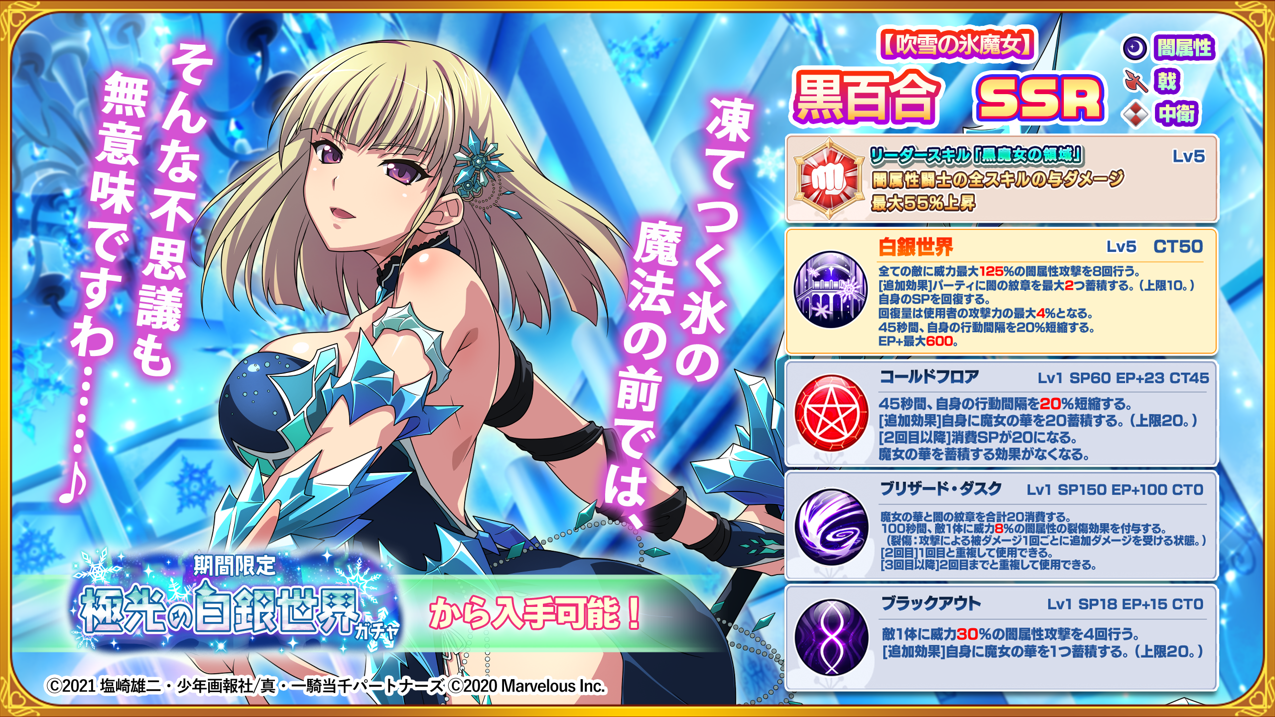 本日開始の「極光の白銀世界ガチャVol.1」では、新たに「【吹雪の氷魔女!?】黒百合」(CV: 大地 葉)」が登場。