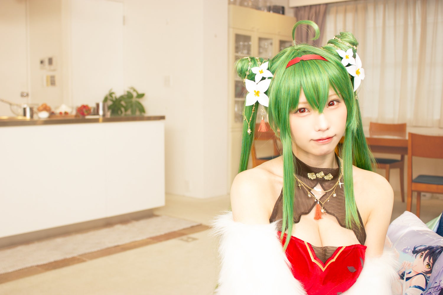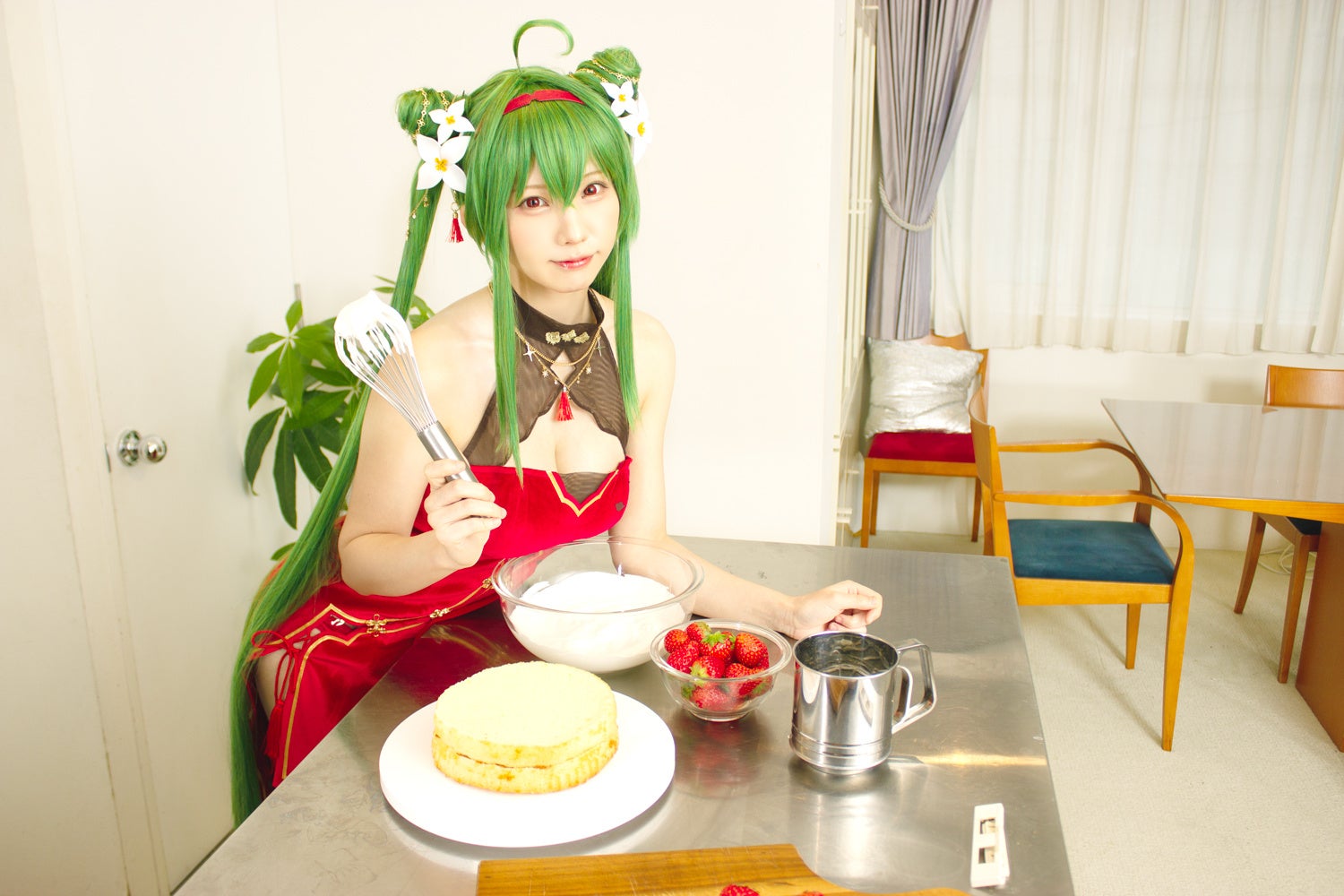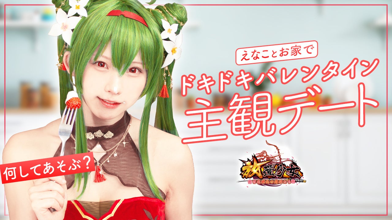 くつろぐご主人様(ユーザー様)がスマホを取り出し放置少女を始めた。「どの副将とデートしようかなぁ… 」 と迷いながら副将一覧から『聖夜の燭光』–劉備を選択。突然劉備にコスプレしたえなこさんがまさか目の前に現れ、ご主人様の横に腰掛けた。トランプを持ち、微笑みかけるえなこさんがご主人様と「放置少女トランプでどっちがジョーカーでしょうか」ゲームをプレイ、結果はえなこさんの負け。えなこさんが作るご褒美バレンタインスイーツを二人で堪能。照れながら「あーん」するえなこさんは見逃せない!