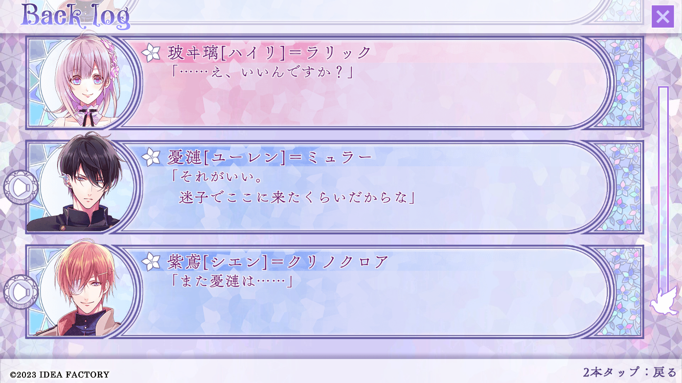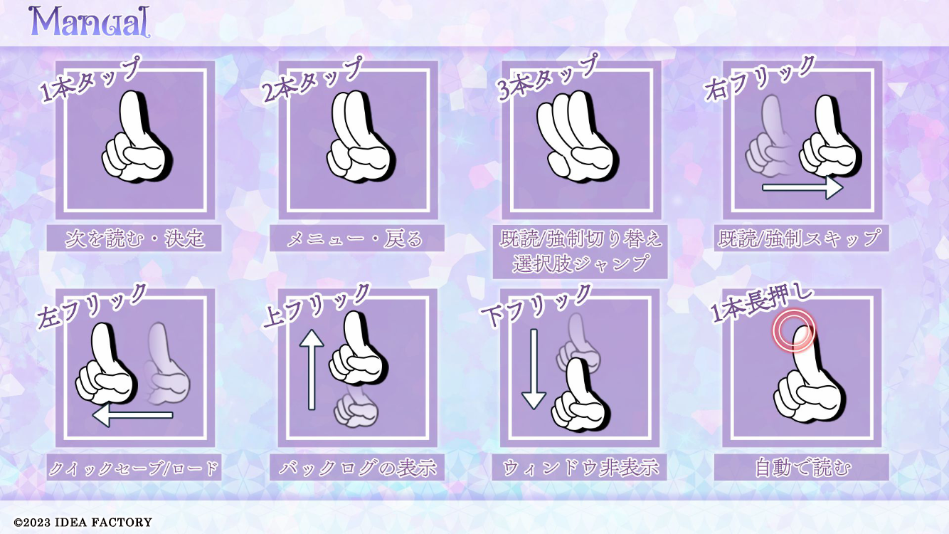 クイックセーブ、クイックロード、バックログ、既読スキップ、未読スキップ、オートモード、選択肢ジャンプなど快適にプレイできるシステムを搭載しています。