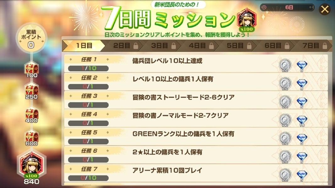 アップデート後ゲームにログインすると、ミッションの1日目のタブが開放となります。