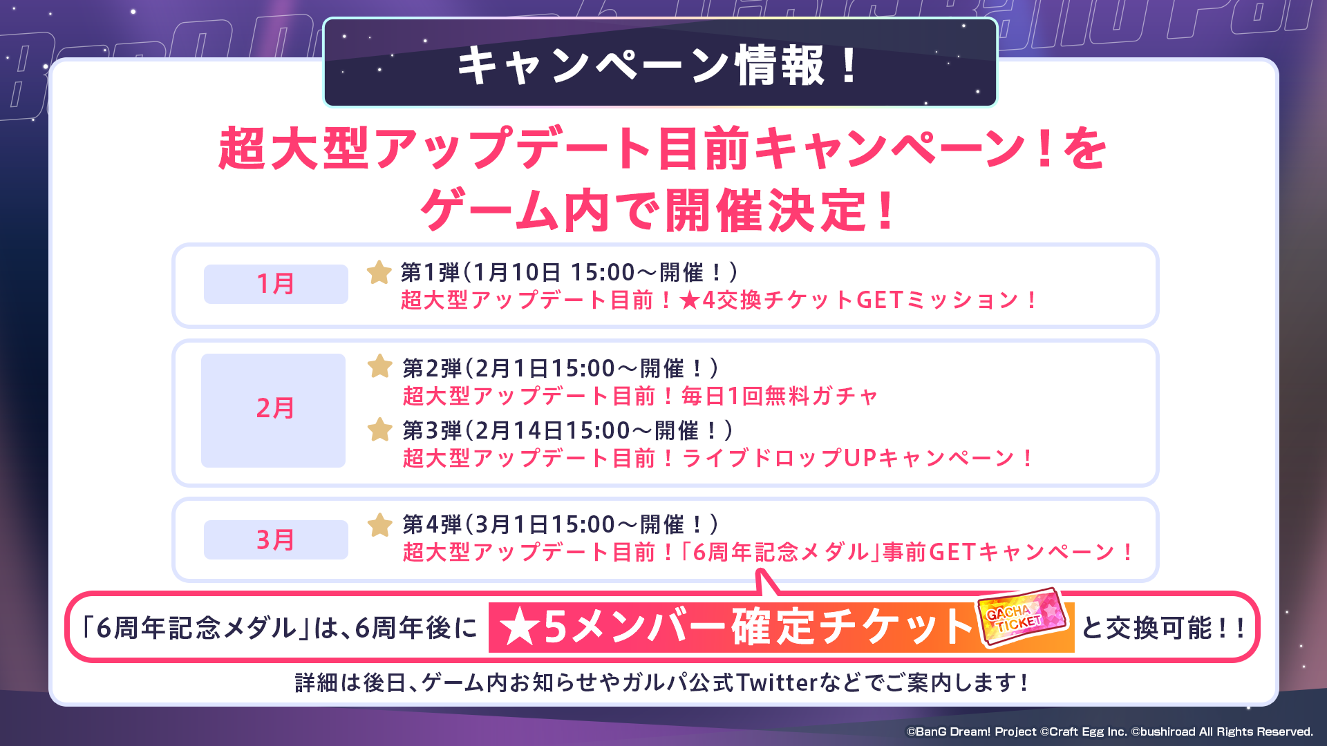 スマートフォンアプリの企画開発事業を展開する株式会社Craft Egg(本社:東京都渋谷区 代表取締役:森川 修一、以下、Craft Egg)と、株式会社ブシロード(本社:東京都中野区 代表取締役社長:木谷 高明、以下、ブシロード)の共同制作によるスマートフォン向けゲーム「バンドリ! ガールズバンドパーティ!」(以下、ガルパ)は、2023年2月14日(火)より「超大型アップデート目前!毎日3回無料ガチャ」と「超大型アップデート目前!ライブドロップUPキャンペーン!」を開催いたしました。また、2023年3月1日(水)より「6周年記念メダル」を手に入れると「★5メンバー確定チケット」と交換できる事前キャンペーンを開催いたします。