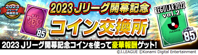 期間中、手に入れた「 2023Jリーグ開幕記念コイン」を使って「お気に入りクラブG85以上レギュラー2022 vol.2ガチャ券」などのアイテムと交換できます。