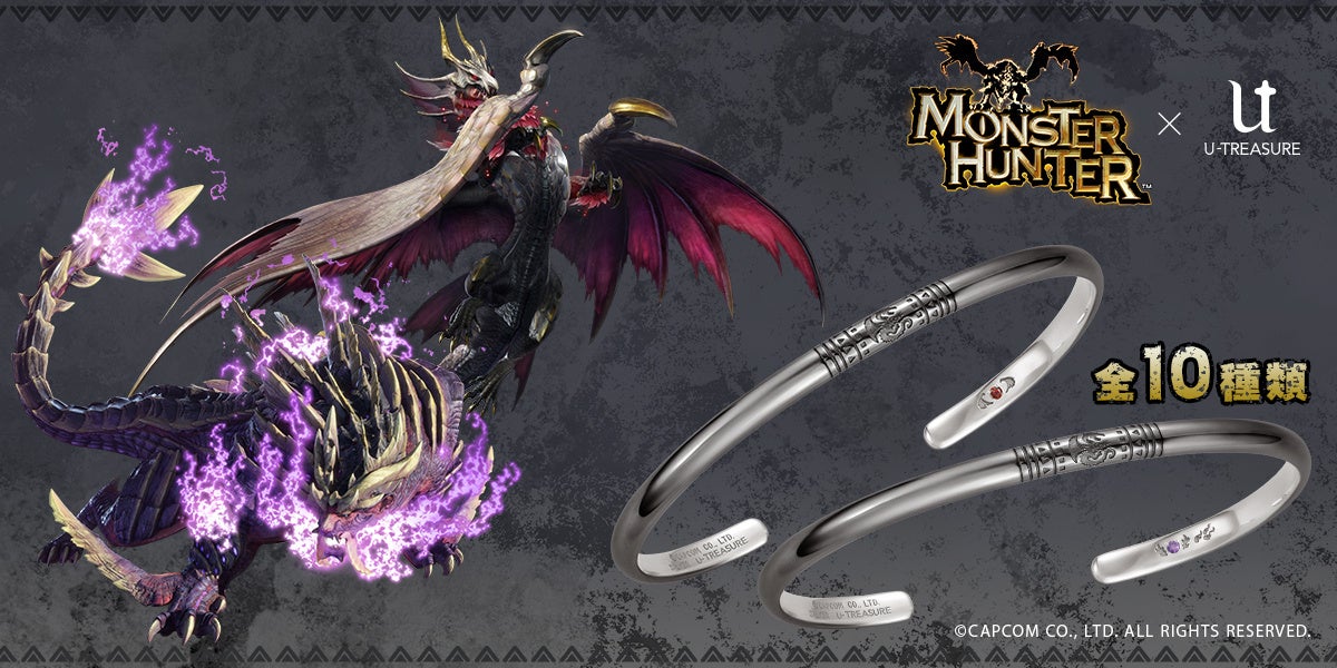このたびの新作は、バングルにブラックコーティングを施し、使い込む中でデニムのようなエイジングを楽しんでいただける仕様です。内側にはそれぞれのモンスターをイメージした刻印と宝石がデザインされています。重ね付けや、販売中の「ハンターの首飾り」「ハンターの指輪」ともおそろいで楽しんでいただけるデザインです。ユートレジャーコンセプトストア池袋およびユートレジャーオンラインショップにてご購入いただけます。