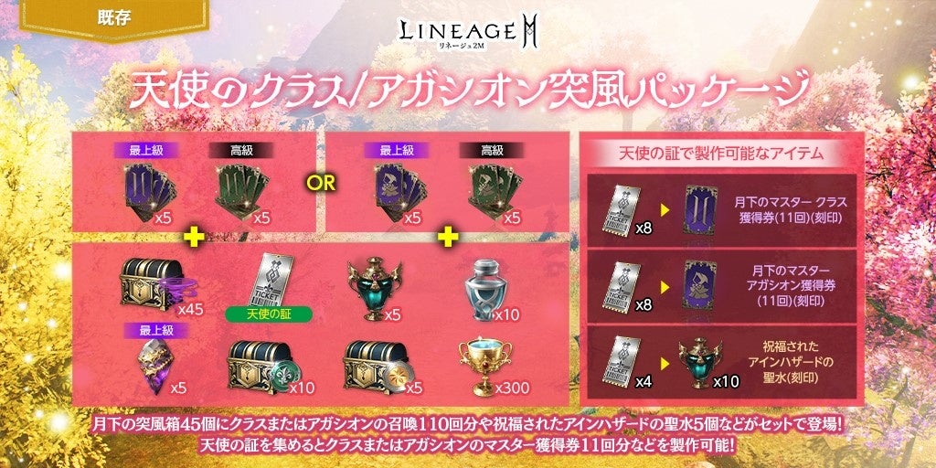 「月下の突風箱(刻印)」45個に、クラスまたはアガシオン召喚110回分、「祝福されたアインハザードの聖水(刻印)」5個、「天使の証(刻印)」1個などがセットになった「天使のクラス/アガシオン突風パッケージ」が登場しました。