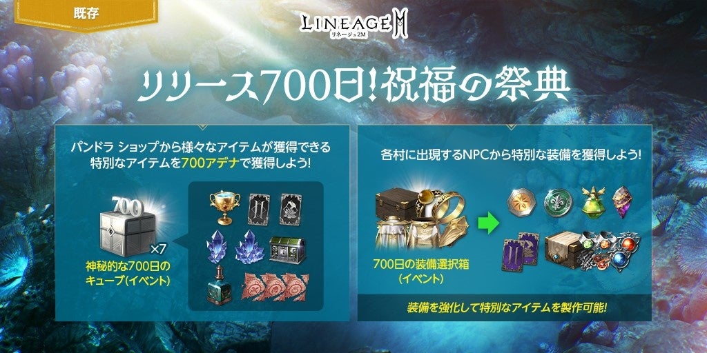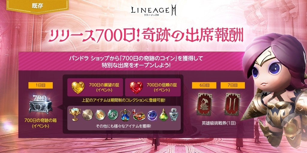 期間中、ショップの交換所にて700アデナで交換ができる「700日の奇跡のコイン(イベント)」を使用することでオープンできる出席報酬「700日の奇跡」が登場します。デイリー報酬として「アインハザードの祝福」2,000が獲得できるほか、期間制コレクション アイテムとして登録できるイベントアイテム「700日の信頼の証(イベント)」「700日の願望の証(イベント)」を獲得できる「700日の奇跡の箱(イベント)」や、「英雄級クラス/アガシオン挑戦券(1回)(イベント)」を獲得することができます。