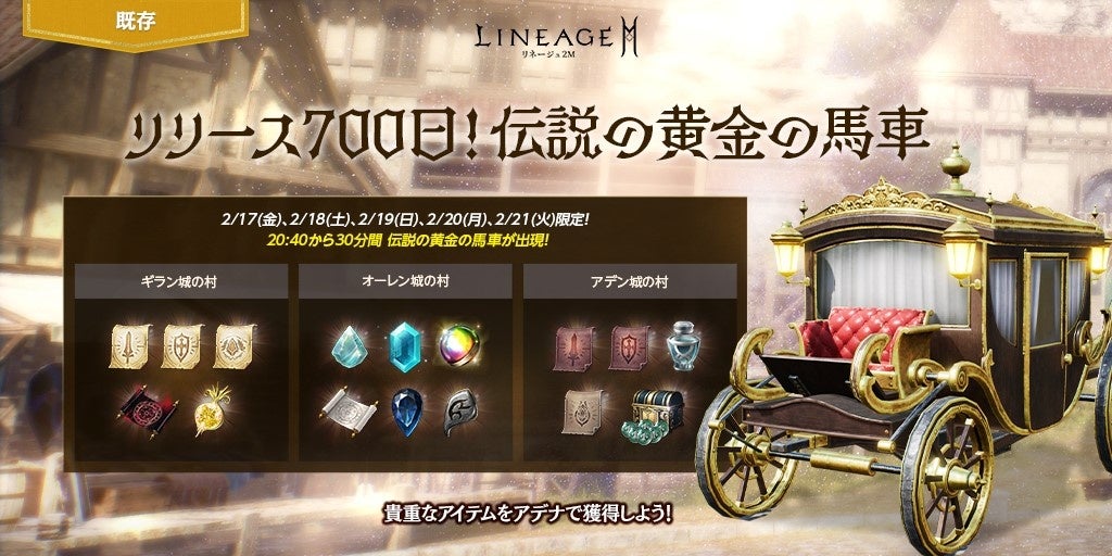 期間中、20時40分 ~ 21時10分の間に「ギラン城の村」、「オーレン城の村」、「アデン城の村」に「黄金の馬車」が登場します。「黄金の馬車」に話しかけると、「英雄級製作図の欠片選択箱(イベント)」や「太古の石(刻印)」「永遠の石(刻印)」「ペンダント強化スクロール(刻印)」「ピュアエリクサー(刻印)」「中級覚醒のポーション(刻印)」など貴重なアイテムをアデナで入手することができます。