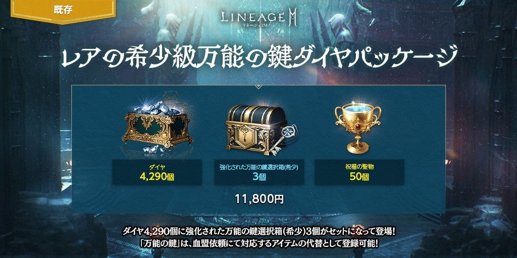 ダイヤ4,290個と「強化された万能の鍵選択箱(希少)(刻印)」3個、「祝福の聖物」50個がセットになった「レアの希少級万能の鍵ダイヤ パッケージ」が登場しました。