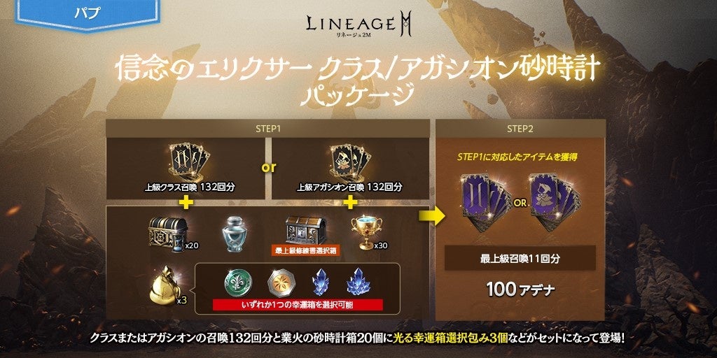 「業火の砂時計箱(刻印)」20個に、クラスまたはアガシオン召喚132回分、「光る幸運箱選択包み(刻印)」3個、「ピュアエリクサー(刻印)」1個などがセットになった「信念のエリクサー クラス/アガシオン砂時計パッケージ」が登場しました。