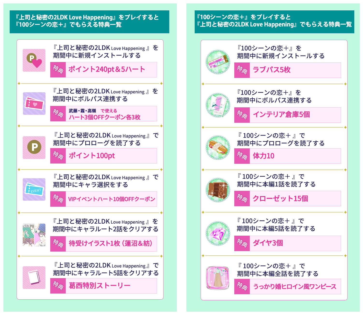 本企画は、胸キュン充電読み物アプリ「100シーンの恋+」 (以下、「100恋+」)と、同居から始まる秘密の恋を描いた「上司と秘密の2LDK Love Happening」(以下、「2LDK LH」)のコラボキャンペーンです。期間中、「100恋+」と 「2LDK LH」 の両アプリをお楽しみいただくと、条件に応じて豪華アプリ内アイテムをプレゼントいたします。条件を達成するごとにもらえるアイテムもどんどん豪華になり、お得に始められるチャンスですので、まだ両アプリもしくはいずれかをプレイしていない方はこの機会をお見逃しなく!