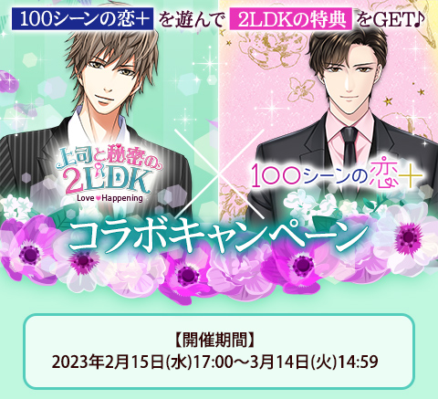 株式会社ボルテージ(本社:東京都渋谷区 代表取締役:津谷 祐司)は、提供中の人気ボル恋タイトル「100シーンの恋+」と「上司と秘密の2LDK Love Happening」のコラボキャンペーンを2月15日(水)より開催することをお知らせいたします。