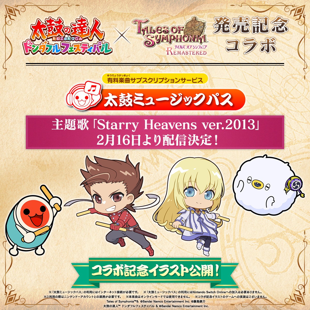 発売を記念して、Nintendo Switch™「太鼓の達人 ドンダフルフェスティバル」にて、「テイルズ オブ シンフォニア」の主題歌「Starry Heavens ver.2013」が配信開始いたしました!