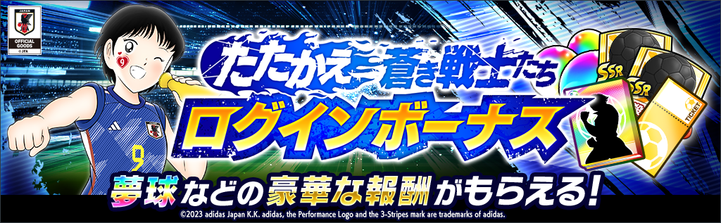 サッカー日本代表公式アウェイユニフォームを着用した岬 太郎、立花 政夫、立花 和夫が新選手で登場!「たたかえ蒼き戦士たち ログインボーナス」で獲得できる専用チケット1枚で1連回すことができます。