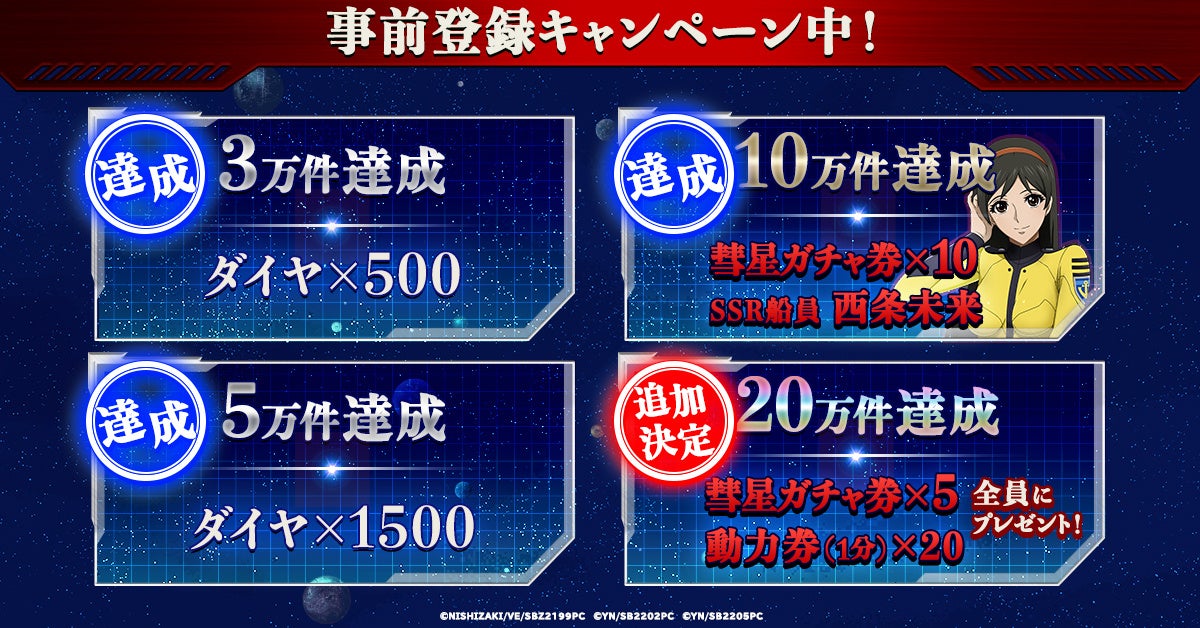 事前登録数の合計が10万件を達成したため、10連分のガチャアイテムと、SSR船員「西条未来」を、サービス開始時に全員にプレゼントすることが決定しています。