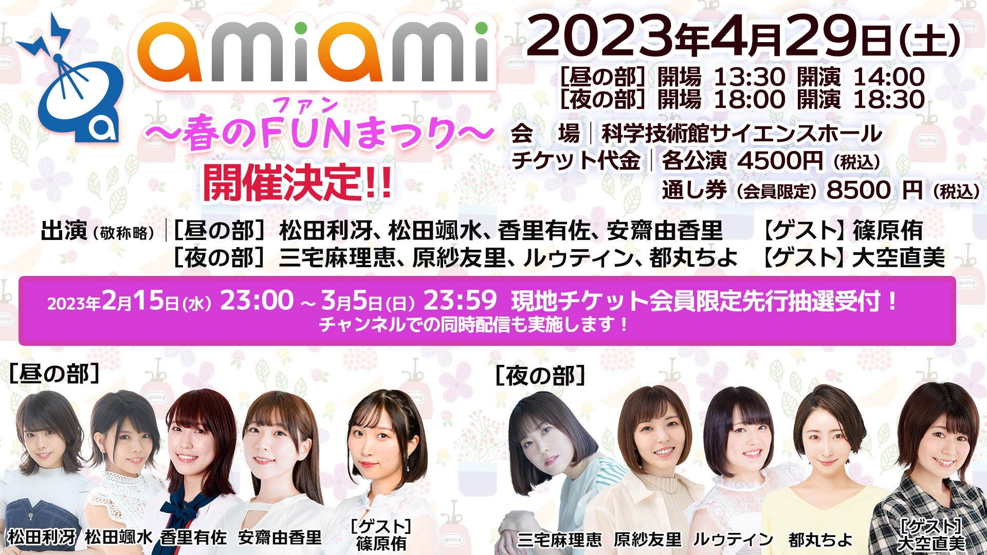 - あみあみが主催する声優フェスイベント「あみあみ~春のファンまつり~」開催が大決定!日程は2023年4月29日(土)、会場は科学技術館サイエンスホールです。
