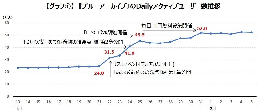 そして、「メグ」「カンナ」が実装、毎日無料10回募集が行われた1月31日には、DAUがイベント開始前の倍以上である52.0万人となっています。その後、連日の無料10連募集の影響もあり、50万人以上のDAUをキープしています。【グラフ①】