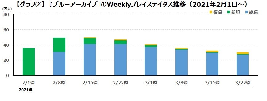 『ブルーアーカイブ』は2021年2月4日に配信が開始され、初週のWAUは36万人、次週には約50万人となっていました。しかし、3月1週から明確ユーザー数の減少が見られます。【グラフ➁】